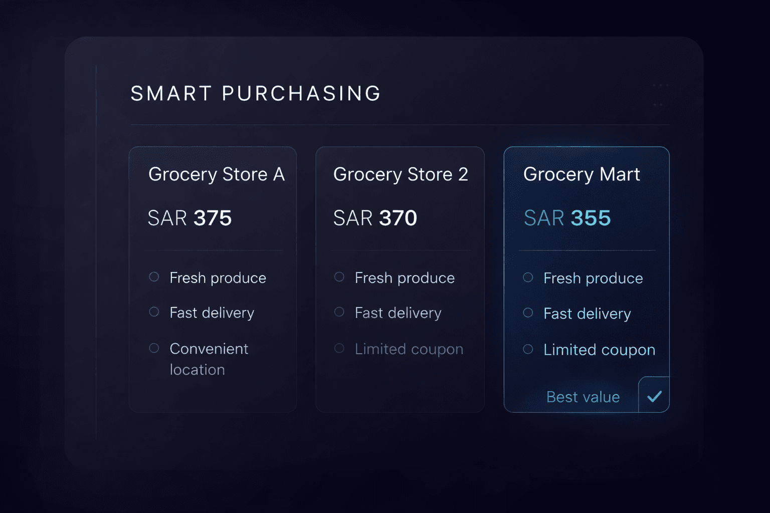 Spend better, not just less. We automatically spot where you're overpaying and surface better deals and local alternatives to help you get more from every Riyal.